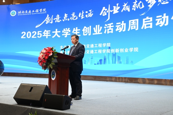 陈衡在讲话中表示,湖南交通工程学院作为扎根湖湘的应用型本科高校,将双创教育贯穿人才培养全过程,构建“理论教学+实践锻炼+项目孵化”育人模式,培育了一批优质创业项目,荣获多项省级以上奖项,以扎实行动体现了高校服务青年、服务地方的使命担当。他指出,创业是时代发展的引擎,湖南省正致力于构建一个可持续的创业生态,用心培育每一颗“金种子”,今日的倾力支持,必将换来明日“金果子”的硕果累累。以此次创新创业活动周为契机,他提出三点希望:一是希望学校持续深化双创教育改革,在汇聚导师、融合资源等方面持续创新,进一步激发学生创新创业活力,为湖南教育事业和经济社会发展培育更多“双创”人才;二是希望青年学子勇担时代创业使命,个人理想融入家乡建设与国家发展,积极在科技创新、乡村振兴、社会服务等领域寻找创业机遇。三是希望社会各界汇聚双创支持合力,通过项目合作、资金扶持、导师辅导等多种形式,为大学生创业提供全程助力,共同营造“鼓励创新、宽容失败、支持创业”的良好氛围。